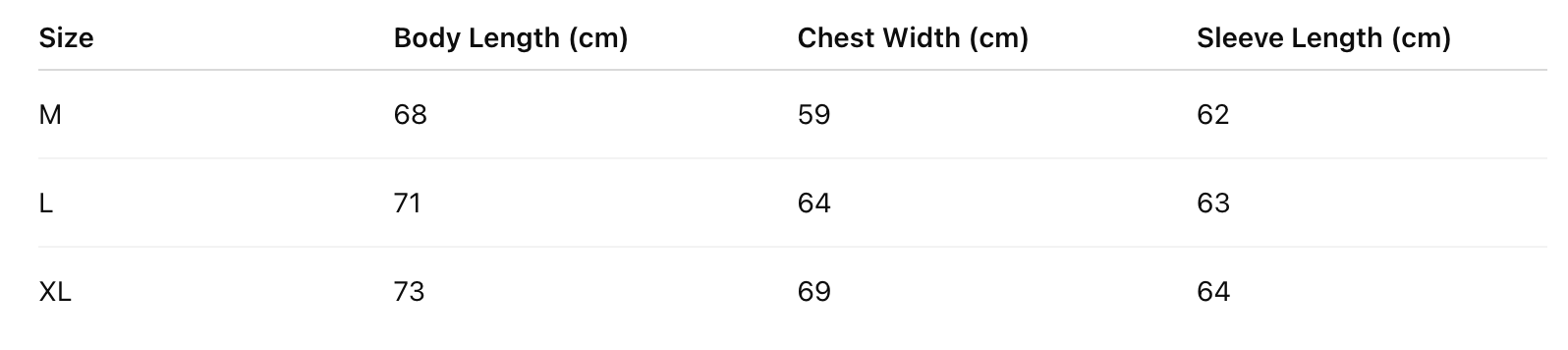 XL Length 73 / Chest 69 / Sleeve 64